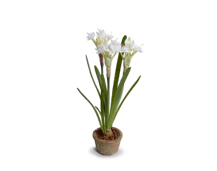 The Paperwhite Narcissus is a classic winter flower - bright green stems topped with small white fragrant flowers. Faux Fresh Paperwhite bulb is "planted" by hand into a 3" round hand made terracotta mini-pot and finished faux dirt.